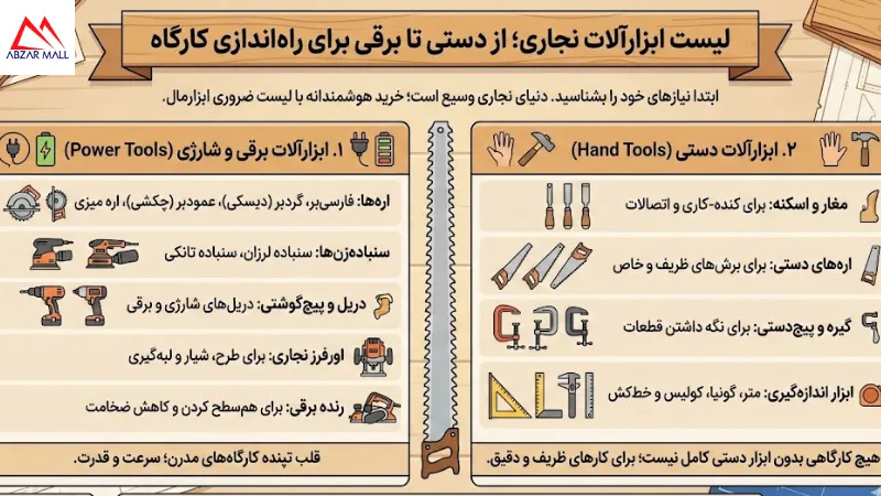 برای راهاندازی یک کارگاه، ابتدا باید نیازهای خود را بشناسید. دنیای نجاری بسیار وسیع است و ابزارها به دستههای مختلفی تقسیم میشوند. برای اینکه خرید هوشمندانهای داشته باشید، ما یک لیست ابزارآلات نجاری ضروری را در دو دسته اصلی ابزار برقی و ابزار شارژی طبقهبندی کردهایم که در فروشگاه ابزار مال موجود هستند: