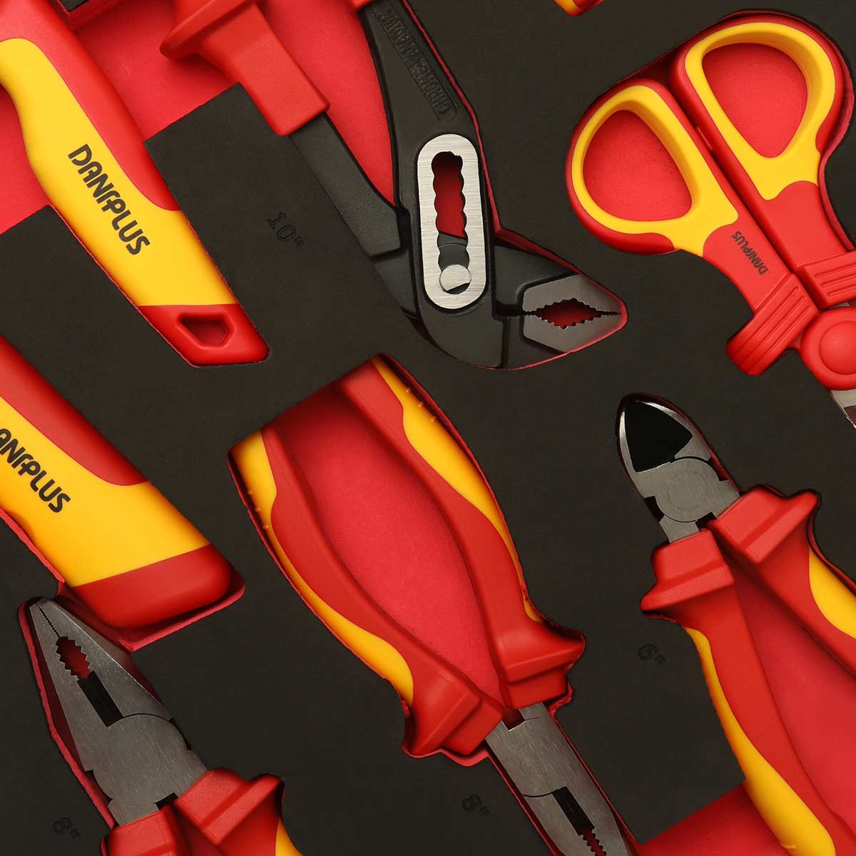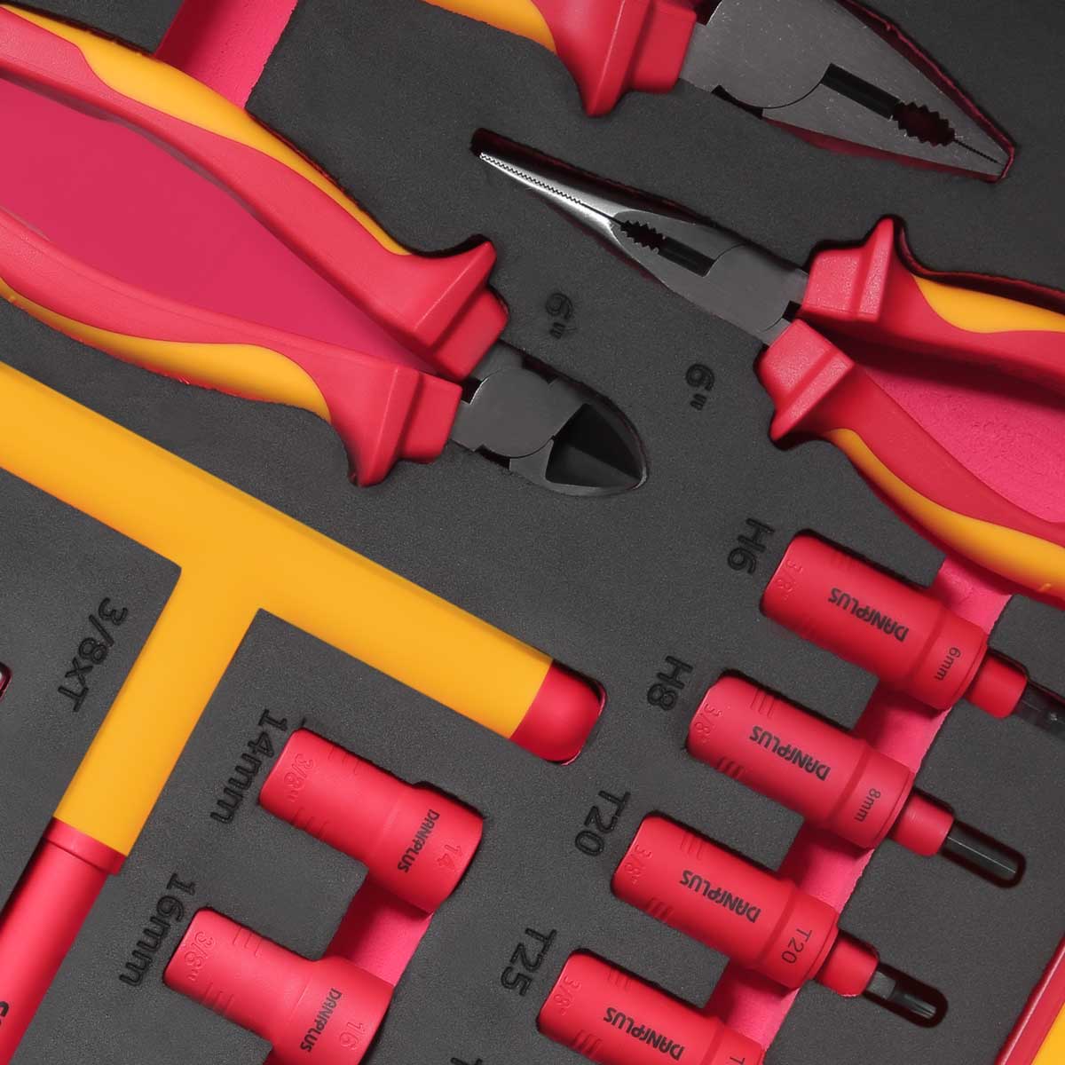 بدنهی ابزارهای داخل جعبه ابزار عایق داناپلاس از فولاد کروم وانادیوم مقاوم در برابر فشار و پیچش ساخته شده و با روکش دوبل عایق پوشانده شدهاند تا خطر برقگرفتگی را به صفر برسانند. فوم قالبی داخل کیف نیز علاوه بر نظمدهی، از آسیب دیدن ابزارها جلوگیری میکند.
