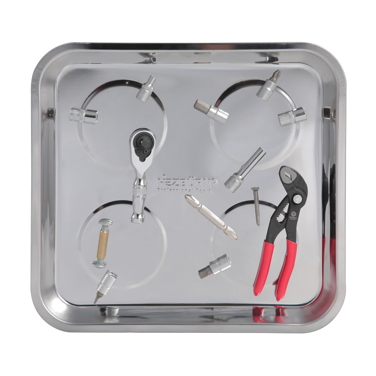 ظرف مگنتی بزرگ هزبرن یک سینی فلزی مجهز به چهار قطعه آهنربای قوی در کف است که قطعات فلزی مانند پیچ، مهره، واشر و ابزارهای کوچک را بهصورت ایمن جذب و ثابت نگه میدارد. این ظرف مگنتی بزرگ علاوهبر نگهداری قطعات، قابلیت اتصال به سطوح فلزی مانند بدنه خودرو، میز کار یا کابینت ابزار را نیز دارند و میتوان آنها را در وضعیتهای مختلف، حتی به صورت عمودی ثابت کرد. نتیجه این طراحی کاربردی، جلوگیری از گم شدن یا افتادن قطعات ریز در هنگام تعمیر، مونتاژ یا دمونتاژ و همچنین افزایش سرعت و نظم کار است.