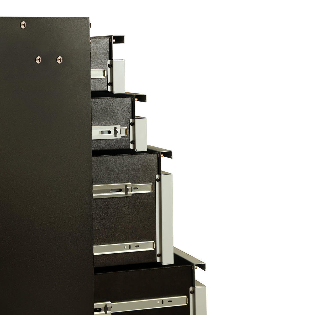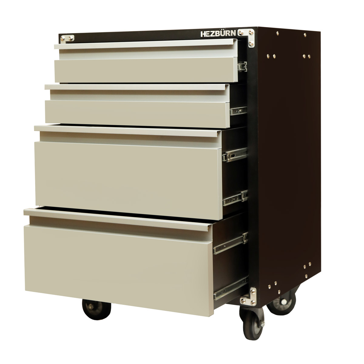 جعبه ابزار و میز کار هزبرن با طراحی ویژهی خود فضای زیادی از محیط را اشغال نمیکند بسیار کمجا و در عین حال محکم و جادار است. کشوهای بالایی مناسب برای ابزارهای کوچکتر و دمهدستی مثل آچار، پیچ گوشتی، انواع انبر و… میباشد. کشوهای آخری عمیقتر بوده و مناسب برای اجناس بزرگتر مثل ابزارهای شارژی و برقی و … است. کشوهای این جعبه به واسطهی ریلهای ساچمهای سه تکه بر روی جعبه سوار شده، بنابراین میتوانید کشو را تا انتها بیرون کشیده و از تمام فضای آن استفاده نماید.